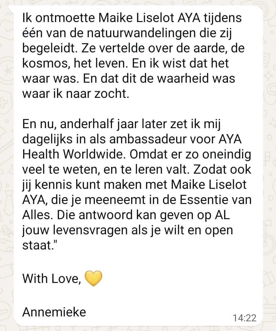 The people in the AYA Ambassadors Network feel an inner drive to contribute to the growth of AYA Health Worldwide and, through this, to their own inner growth. They wish to bring themselves and others into connection with Maike Liselot AYA.