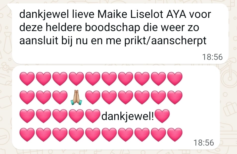Dear Maike Liselot AYA, it was absolutely beautiful!!! I’m so grateful that you continue to share infinite wisdom through yourself. It was breathtaking and also hilarious, with that raw edge running through it. See you in August!