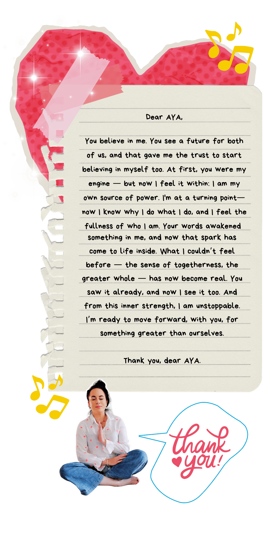Within 3 years, we aim to bring AYA energy into 1,000.000 homes – through products, experiences, or physical presence – so that people are nourished by peace, strength, life force, and love.