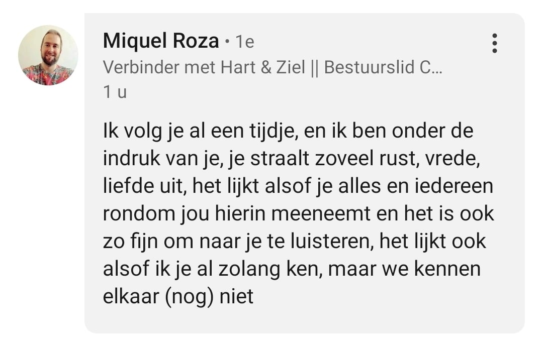 Maike Liselot van Meulen shows and explains how life works, with a knowledge and universal wisdom that goes beyond anything I have learned so far in any training or education. By re-examining everything I had accepted as truth about myself, life and the world, and by focusing on harmony and stability within myself, I am now more grounded than ever and see possibilities that I did not see before.