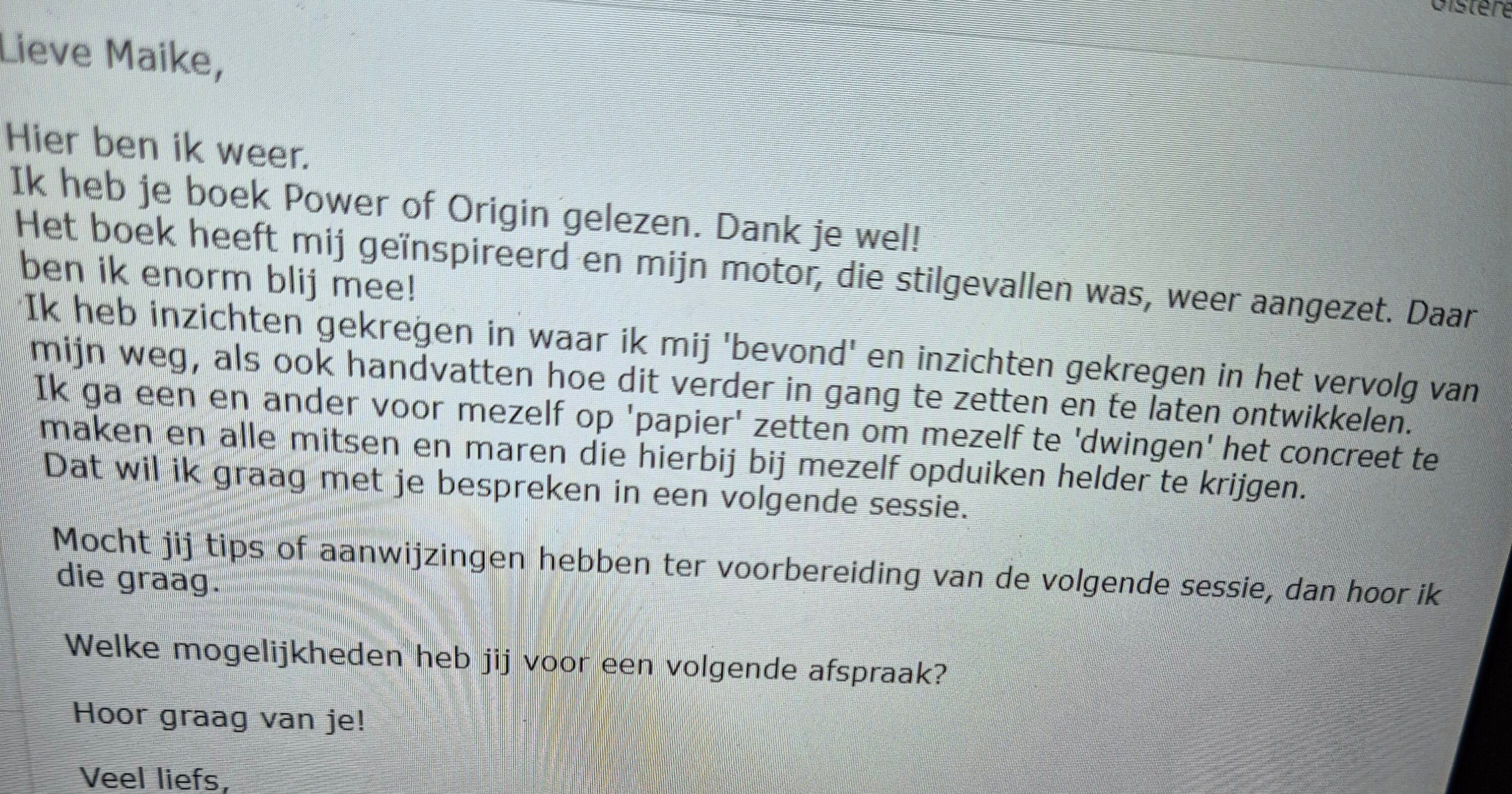 I have read your book The Power of Origin. Thank you! The book has inspired me and restarted my engine, which had come to a standstill. I am incredibly happy about that.