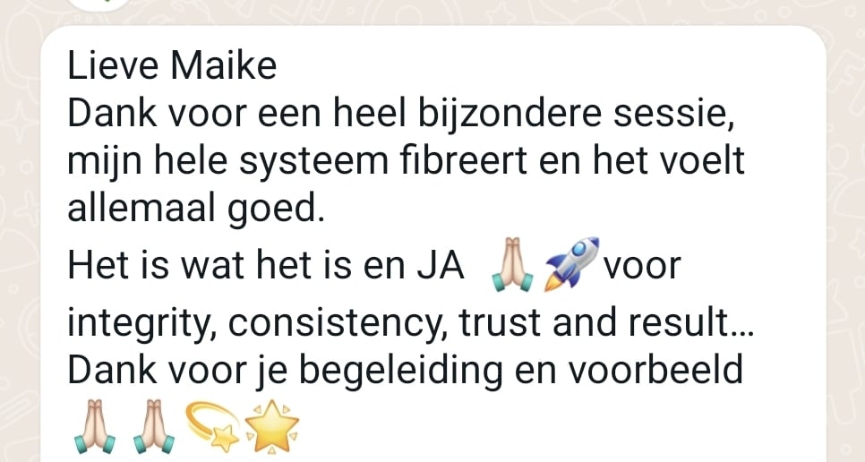 Dear Maike, thank you for a very special session. My entire system is vibrating and it all feels right. It is what it is — and YES to integrity, consistency, trust and results. Thank you for your guidance and for being an example.