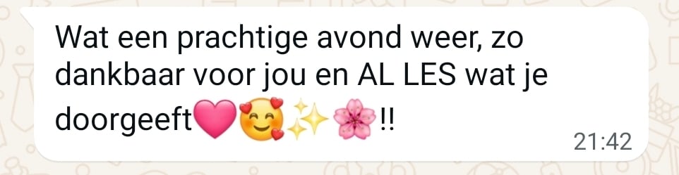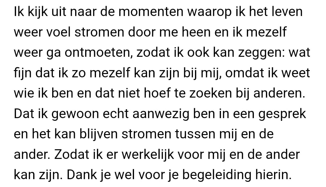 I look forward to the moments when I feel life flowing through me again and meet myself again, so that I can also say: how good it feels to be so fully myself with myself, because I know who I am and no longer need to search in others. That I can truly be present in a conversation and allow it to keep flowing between me and the other. So that I can genuinely be there for myself and for the other. Thank you for your guidance in this.