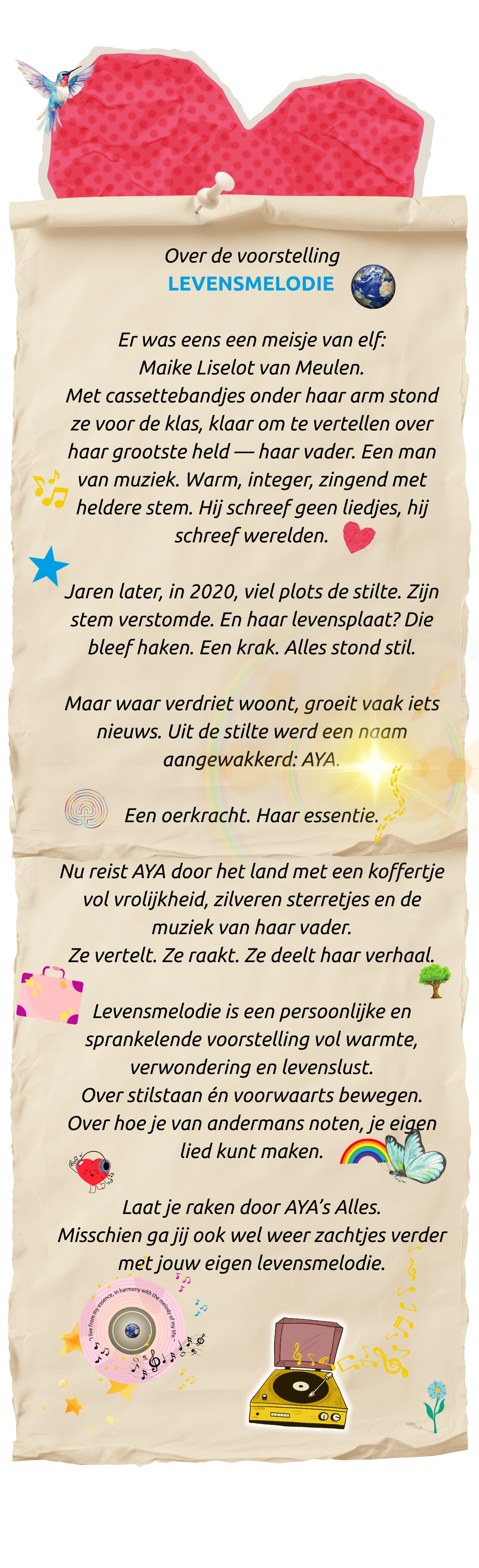 Dit heb je te ervaren. Het is AYA die het leven onder een vergrootglas legt en je meeneemt in de manier waarop zij de wereld beleeft. Rauw, grappig en recht voor z’n raap. Voel je welkom.